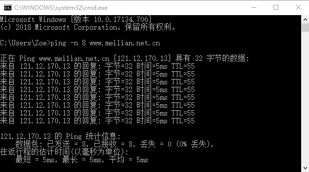 例美國服務(wù)器使用“-n”參數(shù)指定對主機(jī)www.meilian.net發(fā)送8次ICMP數(shù)據(jù)包命令執(zhí)行情況如圖4所示: